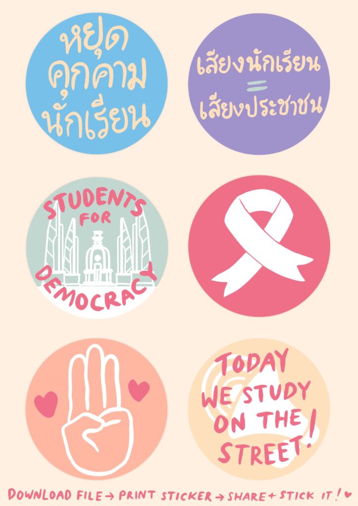 กดลิงค์นี้เพื่อดาวน์โหลดภาพสติ๊กเกอร์ น้อง ๆ สามารถพิมพ์ลงกระดาษสติ๊กเกอร์ขนาด A4 ได้แผ่นละ 2 ชุด หรือตั้งค่าให้พิมพ์เป็นกระดาษ A5 แล้วใช้กรรไกรตัดสติ๊กเกอร์แต่ละอันอกมาเป็นดวง ๆ หรือจะทำเป็นเข็มกลัดติดเสื้อ ติดกระเป๋า ตอนไปโรงเรียนหรือตอนไปร่วมแสดงจุดยืนทางประชาธิปไตยก็ได้นะ
